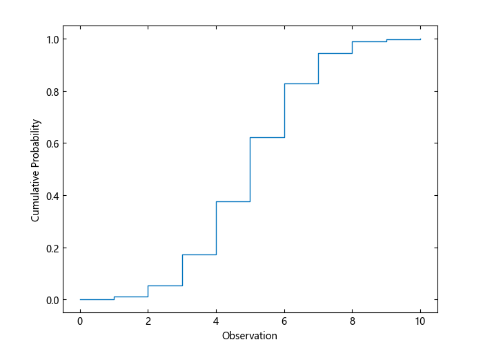 用 10 次试验计算二项式分布的 cdf,成功概率为 0.5。