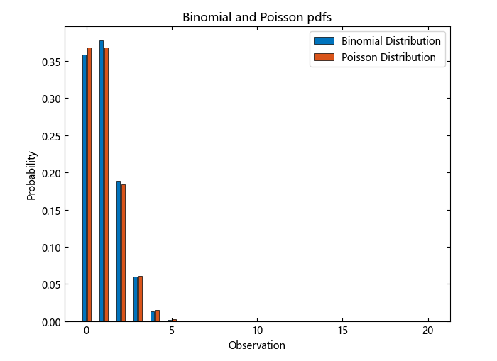泊松分布的 pdf 非常接近二项分布的 pdf。
