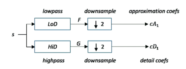 从一个长度为 N 的信号 s 开始,计算出两组系数:近似系数 cA1 和细节系数 cD1。用尺度滤波器 LoD 对信号进行卷积,然后再进行二抽取,就可以得到近似系数。同样,用小波滤波器 HiD 对 s 进行卷积,然后再进行二抽取,就可以得到细节系数。