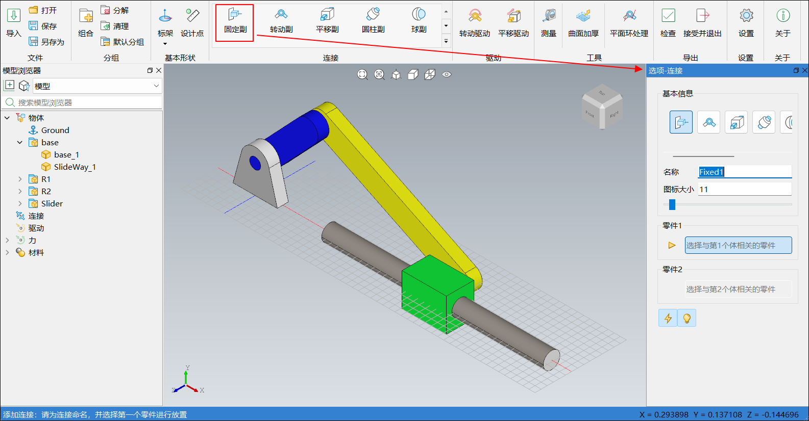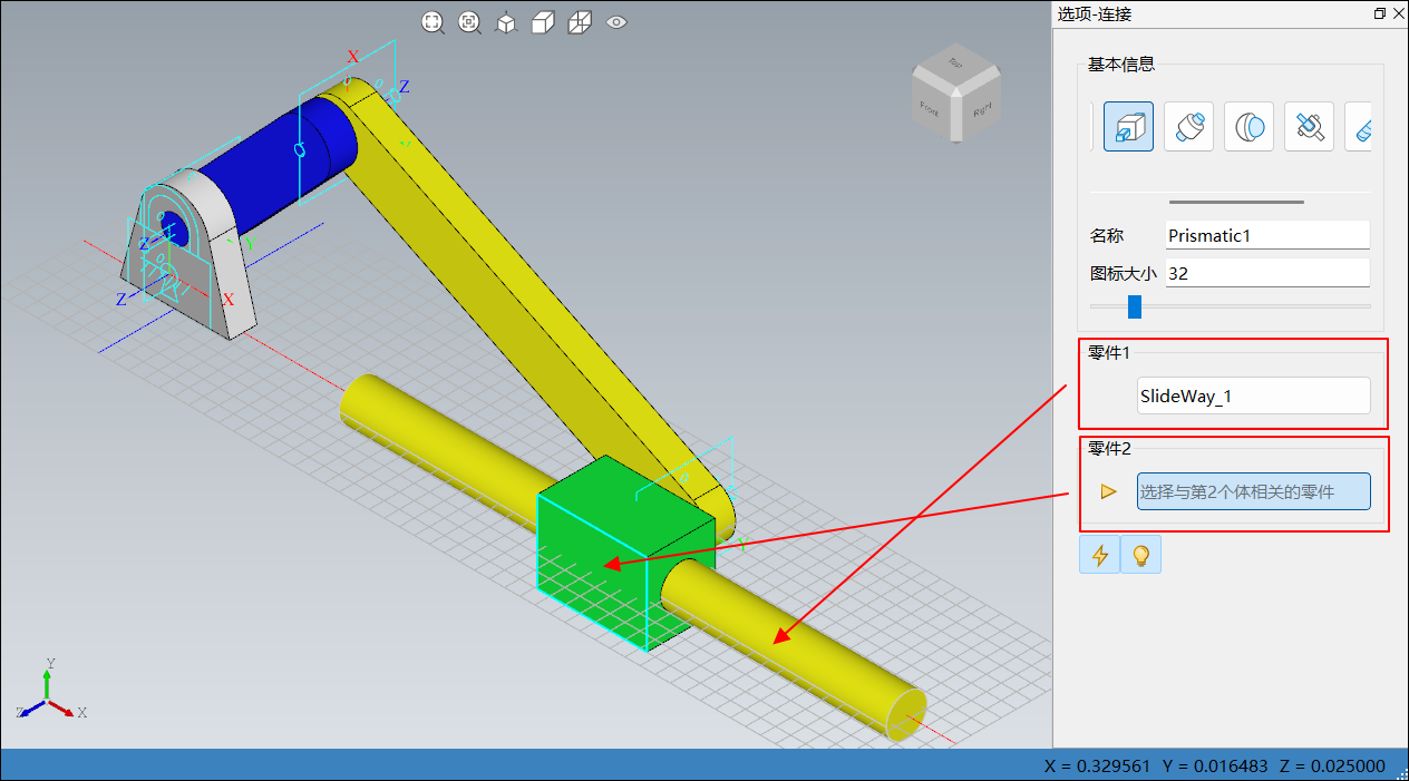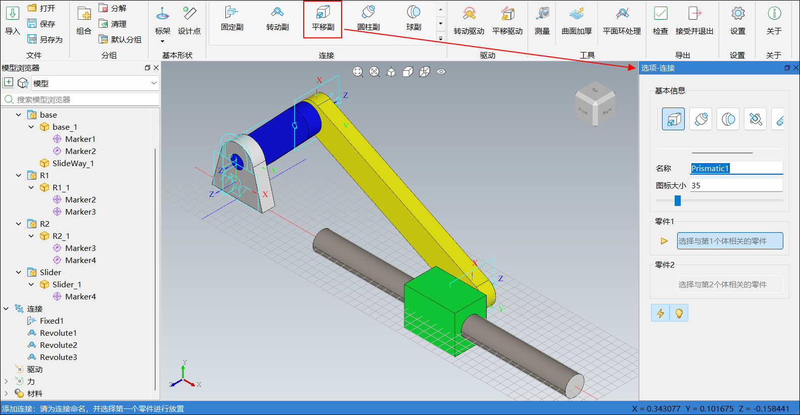 单击菜单栏连接中平移副,右侧边栏选项-连接窗口切换为平移副,如下图所示: