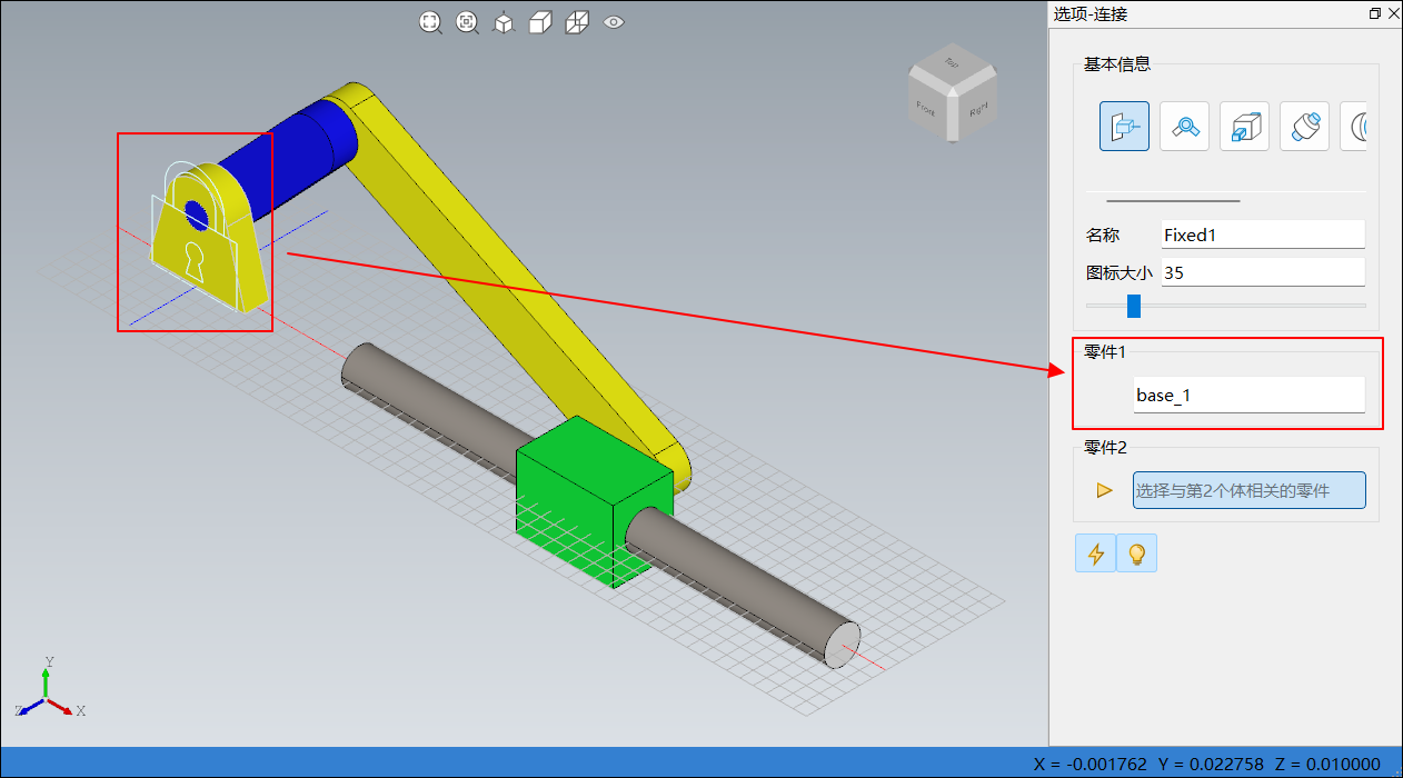 base_1上,鼠标会跟随显示一个固定副图标,按住 Alt 键,滚动鼠标滚轮,放大固定副图标至合适大小,然后在零件base_1上合适位置单击,将固定副Fixed1放置到零件base_1上,完成零件 1的选择,如下图所示: