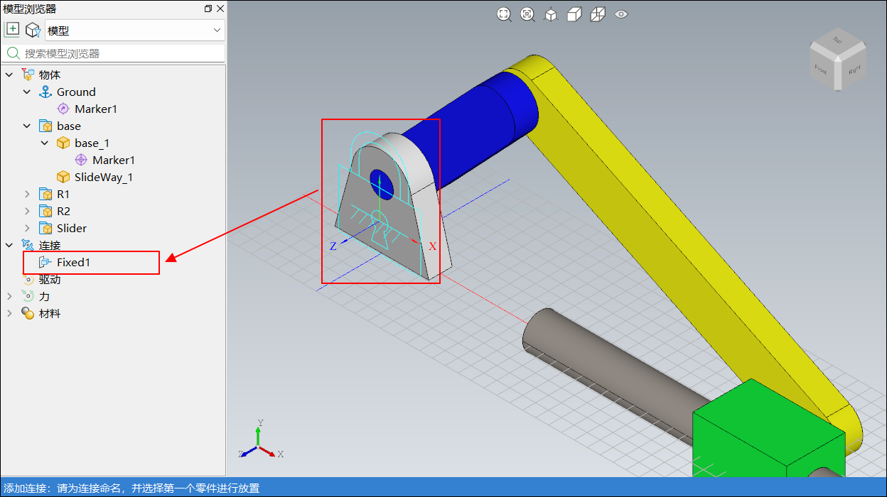 base与大地固定,零件 2 选择Ground即可,可以单击三维视图窗口空白处,也可以选中模型浏览器中Ground节点,此时三维视图中的固定副Fixed1的图标由白色变成青绿色,表示完成该固定副的添加,如下图所示: