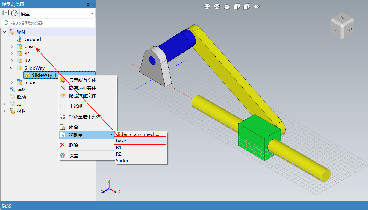 SlideWay_1后,右击弹出上下文菜单,单击移动至,在菜单中单击base,将零件SlideWay_1移动至分组base下,如下图所示: