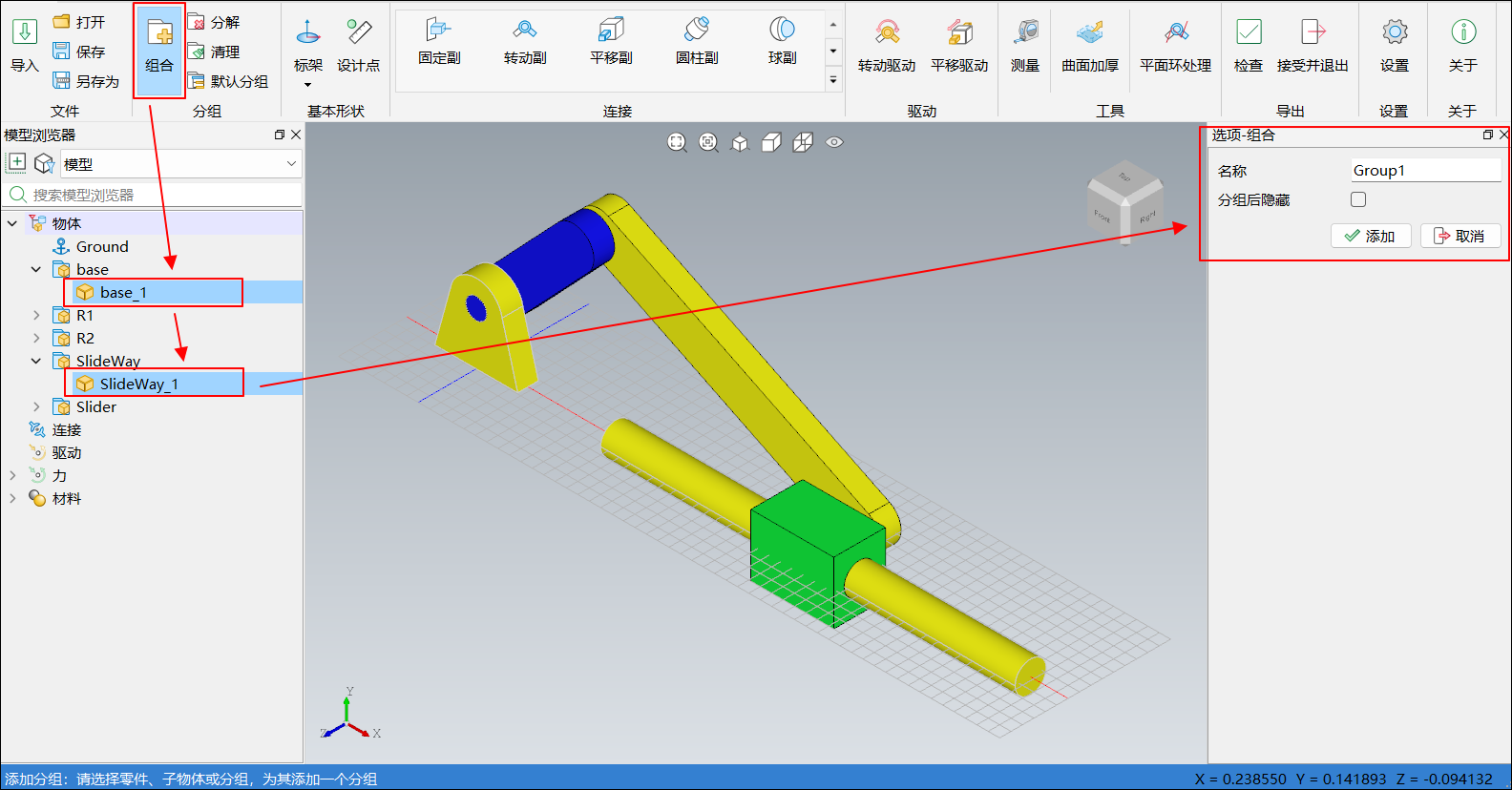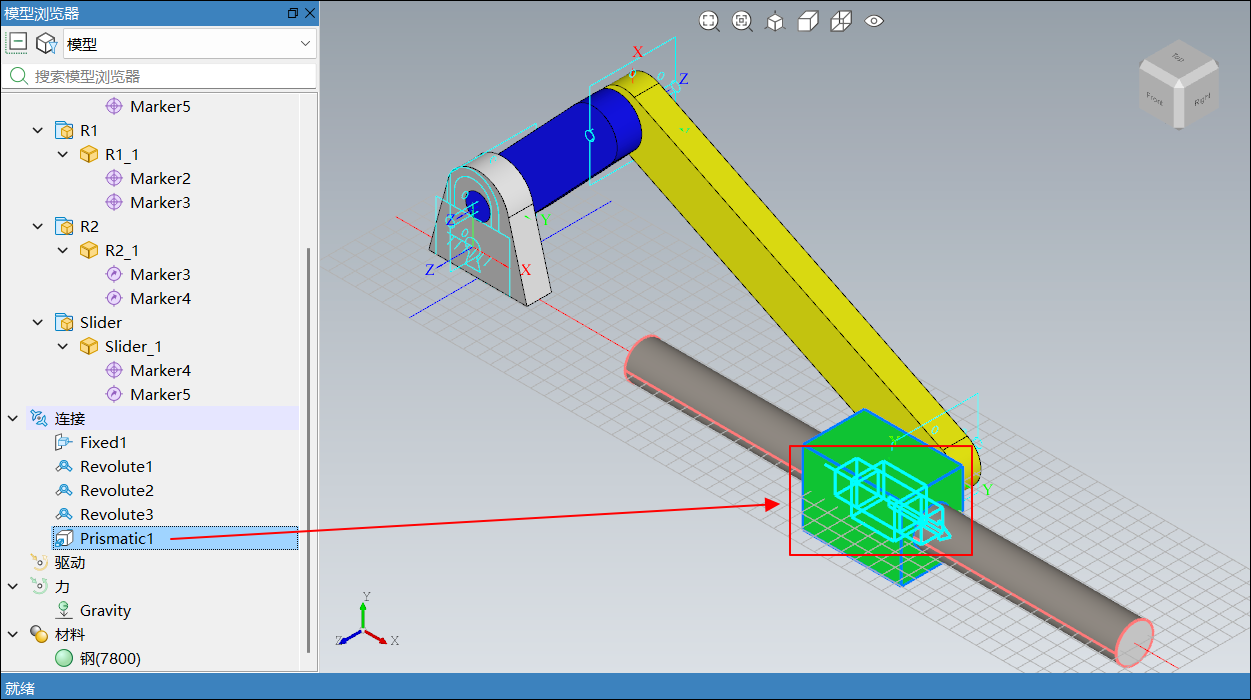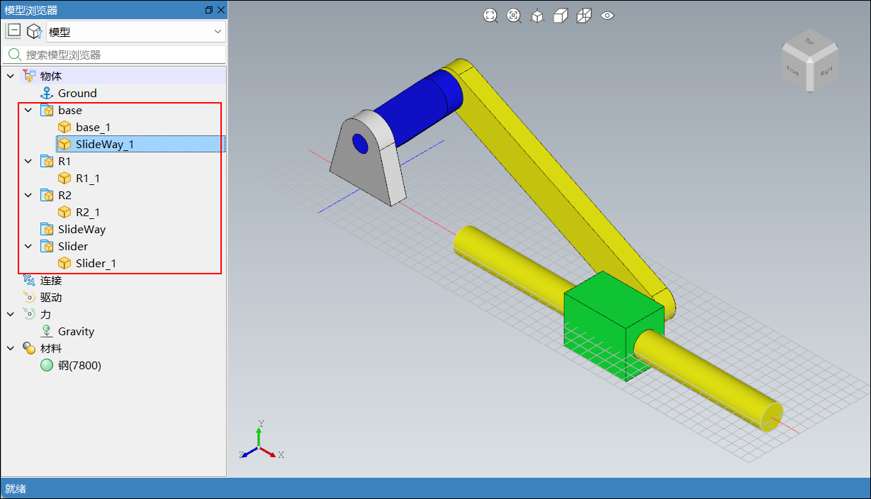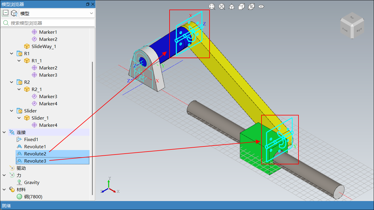 零件 1 零件 2 连接名 R1_1 R2_1 Revolute2 Slider_1 R2_1 Revolute3 添加完成后,如下图所示: