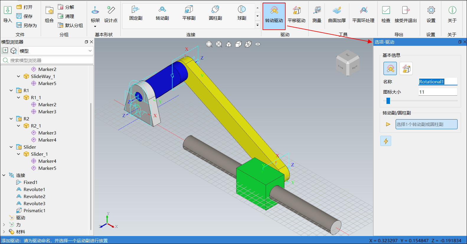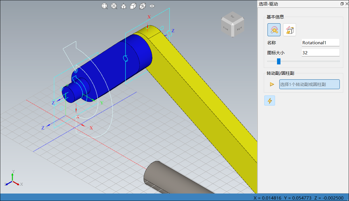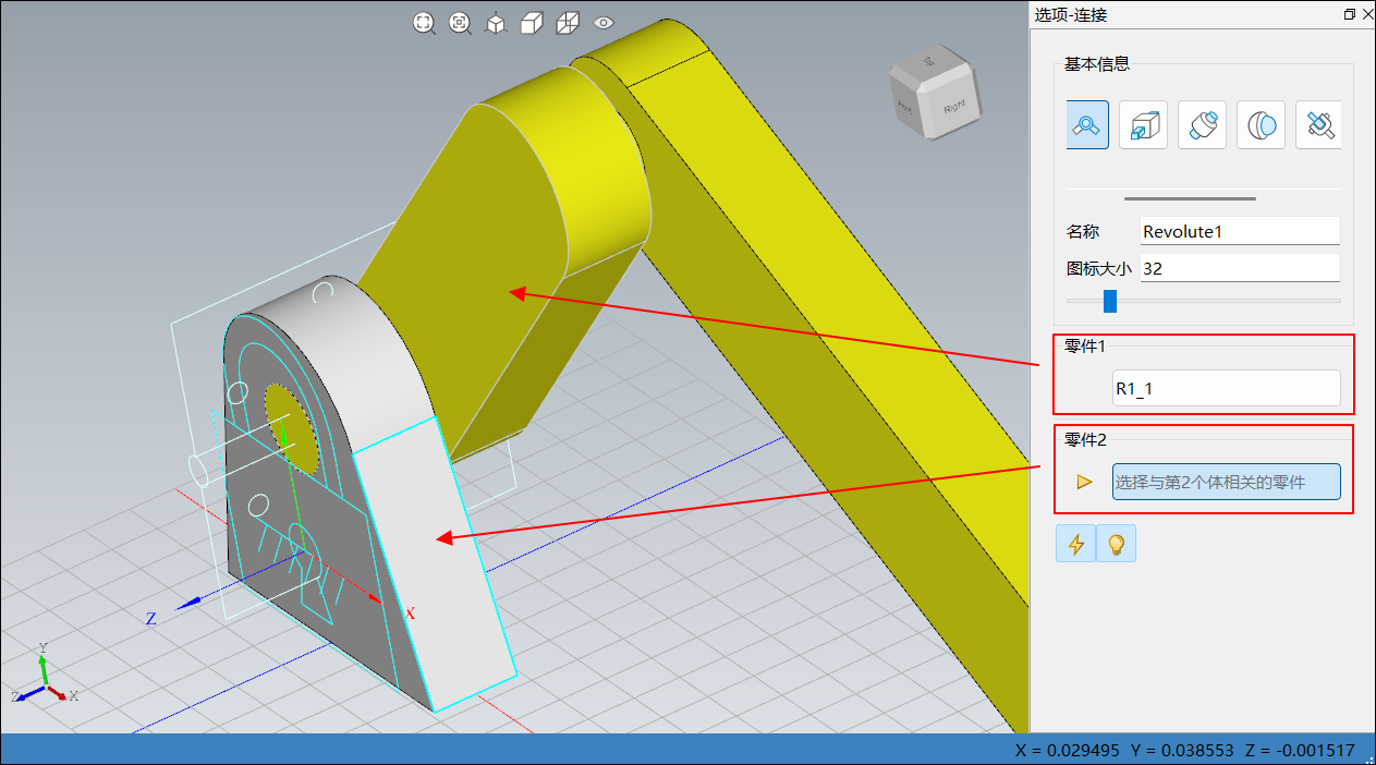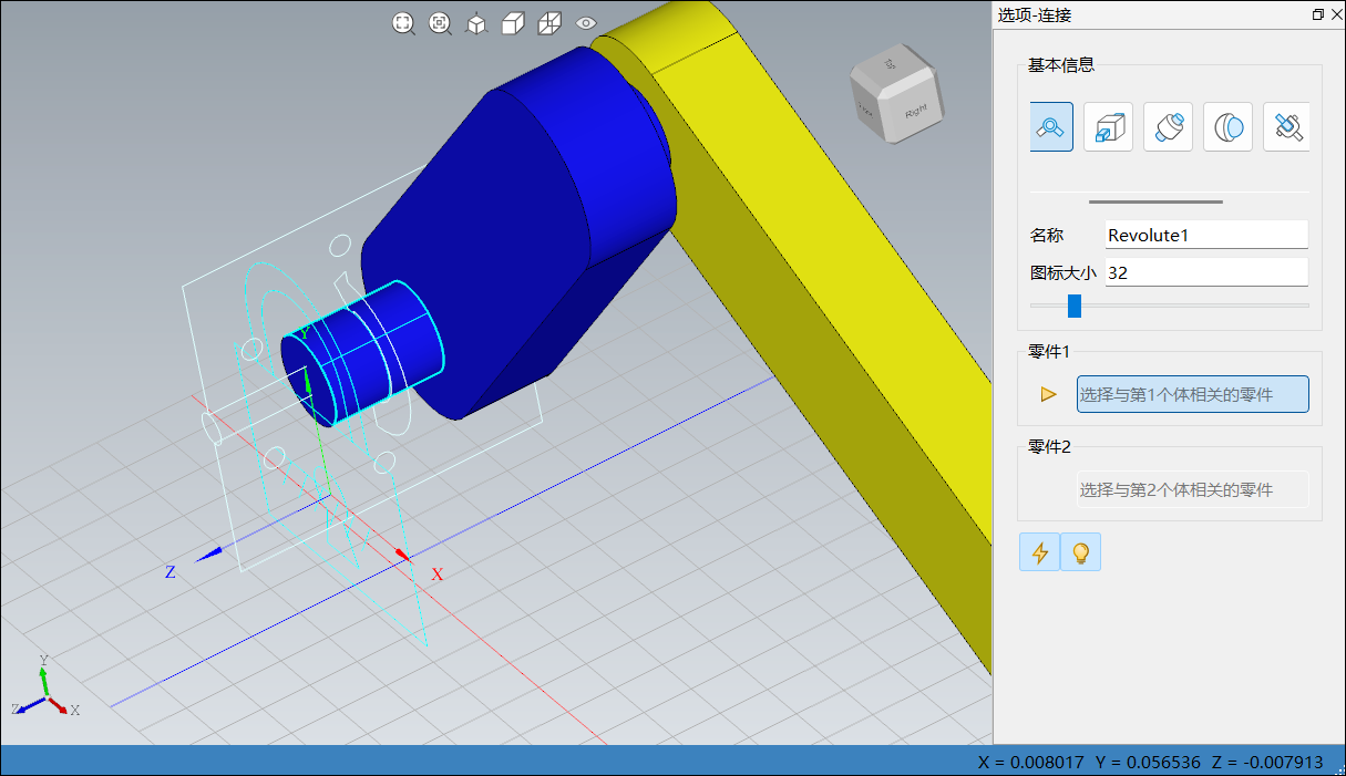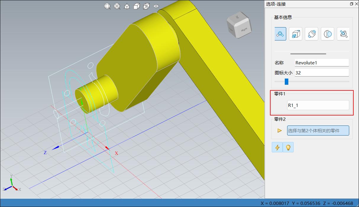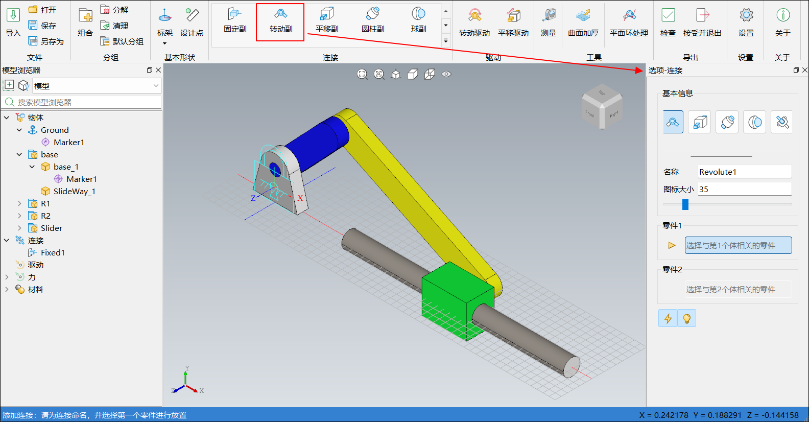 单击菜单栏连接中转动副,右侧边栏选项-连接图标变更为转动副,如下图所示: