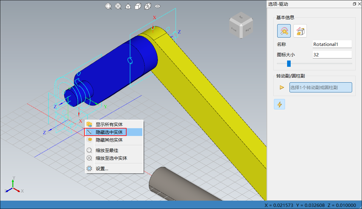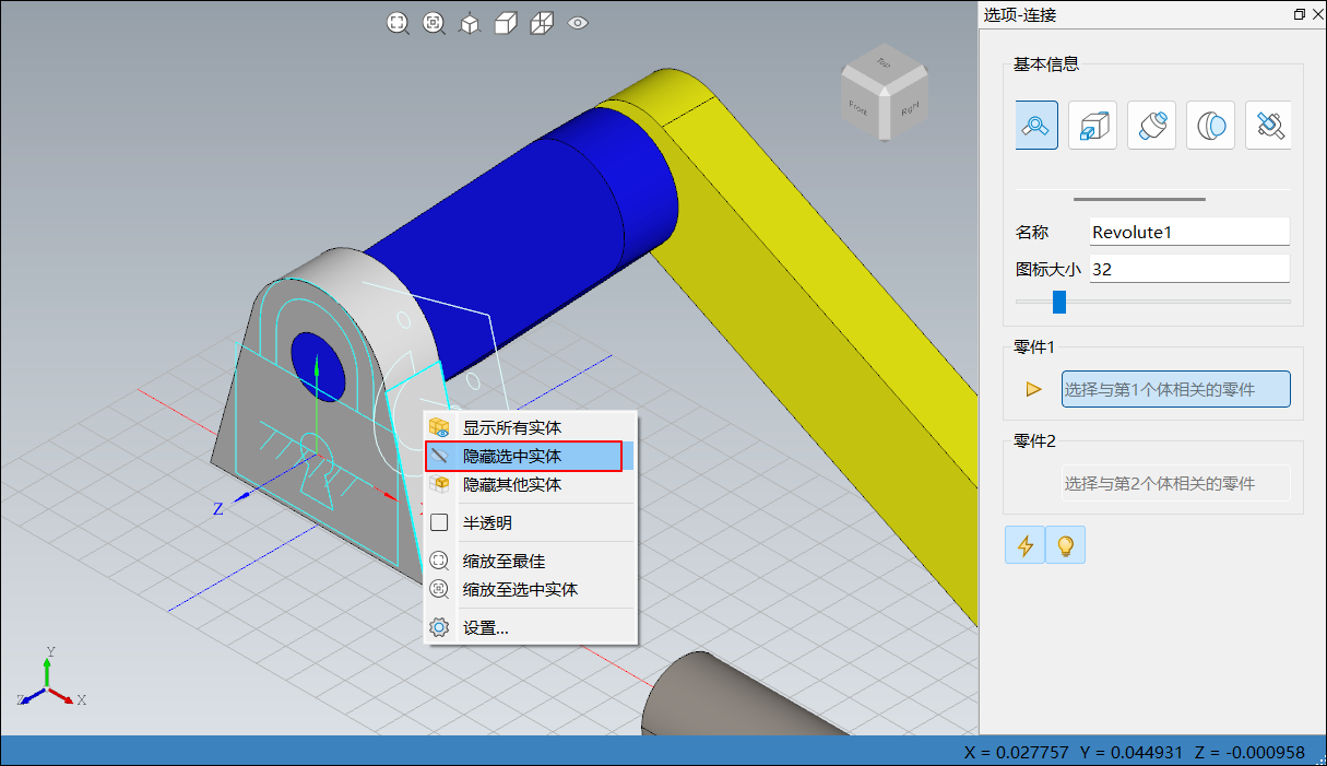 base_1上,直接右击,在弹出的上下文菜单中单击隐藏选中实体,将零件base_1隐藏,便于添加转动副,如下图所示: