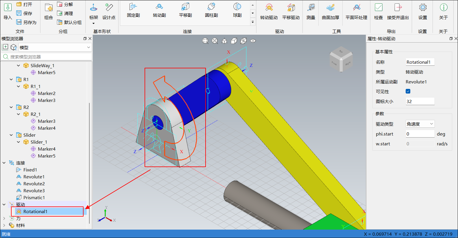 直接单击,此时三维视图中的转动驱动图标由白色变成红色,表示转动驱动
