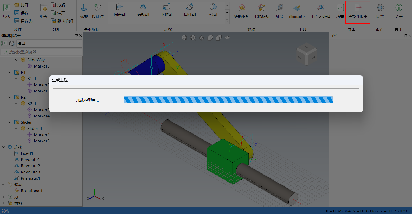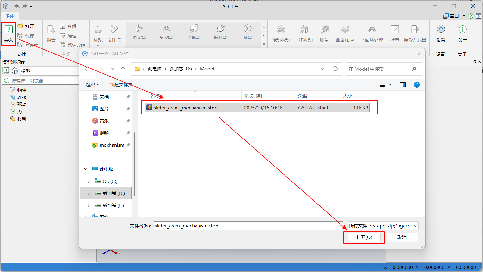 单击导入,弹出选择一个 CAD 文件窗口,选择步骤 1 中准备好的曲柄滑块机构模型,单击打开,弹出导入进度条,请等待模型加载。