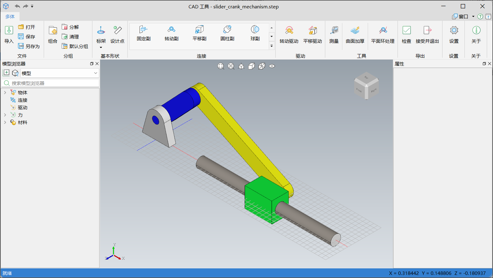 准备一个曲柄滑块机构模型的 CAD 文件:slider_crank_mechanism.step (右击 -> 弹出上下文菜单 -> 将链接另存为)。