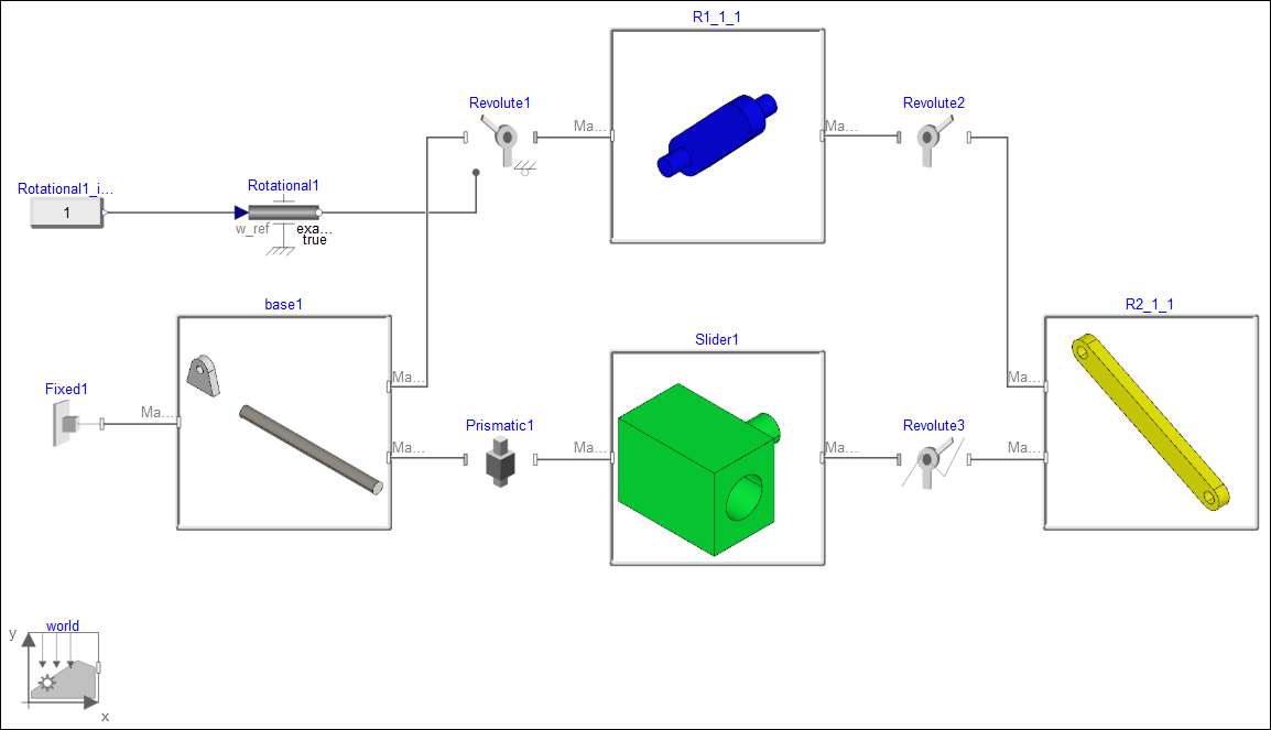 slider_crank_mechanism_main.mo,图形窗口中显示生成的 Modelica 框图模型,如下图所示: