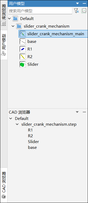 Default,同时左下角 CAD 浏览器中新增导入的曲柄滑块机构模型,如下图所示: