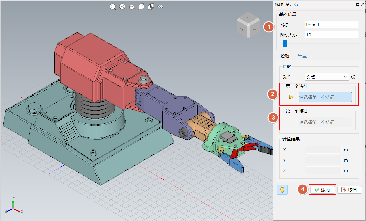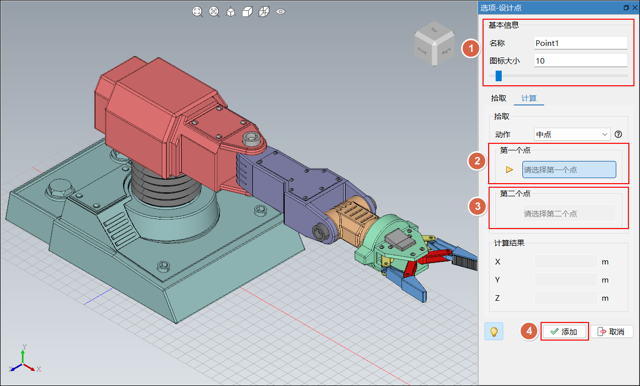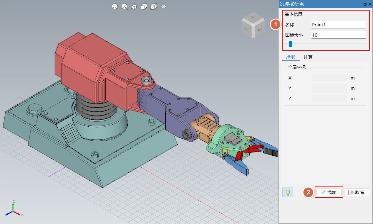 设计点是辅助用户在 CAD 模型上的特定位置进行定位的几何元素,用于放置连接或标架。 设计点支持两种放置模式:拾取模式和计算模式,默认为拾取模式。