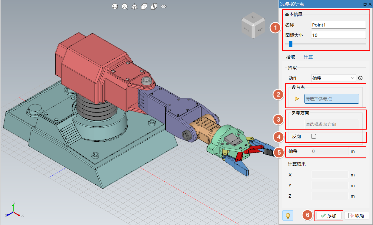 参考点:鼠标移动至三维视图中,在 CAD 模型上选择位置,单击鼠标,确定参考点位置;