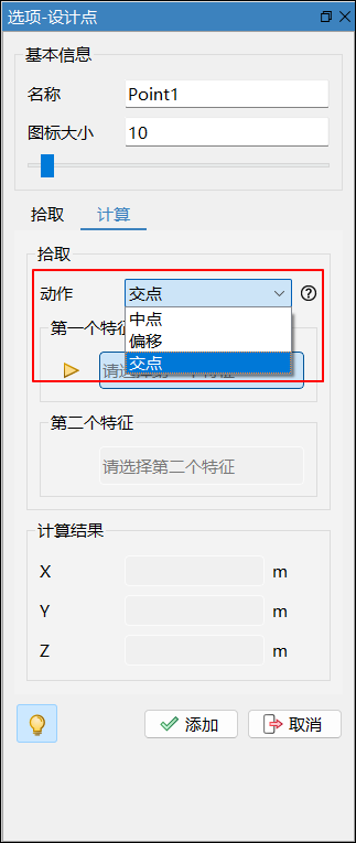 交点模式为用户提供选择两个几何特征,智能计算出其交点为添加设计点的位置。