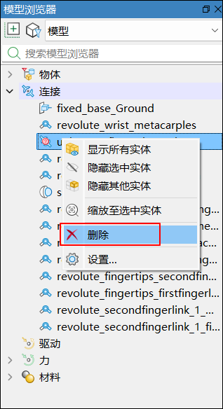 当然,也可以直接删除未知类型运动副,在模型树或三维视图中单击选中未知类型运动副,通过 Delete 快捷键或右击弹出上下文菜单,单击删除即可。
