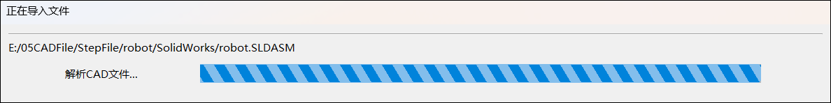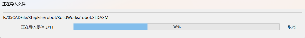 模型导入包含文件读取与解析、导入零件、约束求解和视图更新等多个阶段,其中,导入零件的阶段是百分比进度条,其它阶段是滚动进度条。
