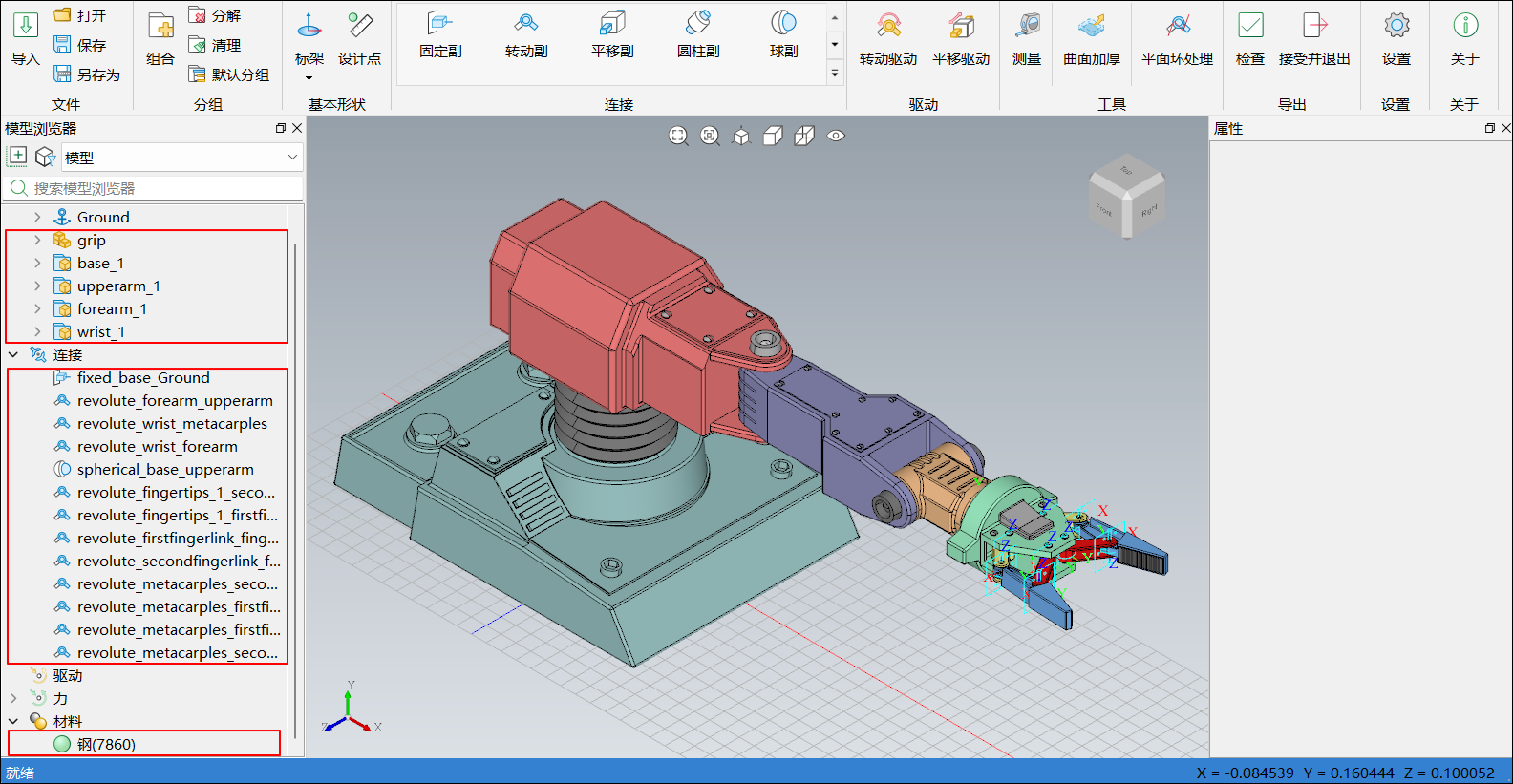 运动副类型_零件一名称_零件二名称; - 如果模型中包含材料信息,则材料目录下会显示对应的材料节点。