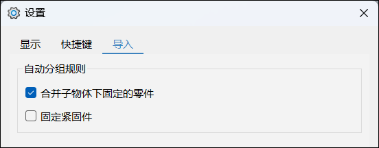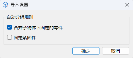 - 合并子物体下固定的零件:根据模型中零件之间的固定和锁定关系,将子物体下固定的零件合并为一个分组,默认为勾选状态;