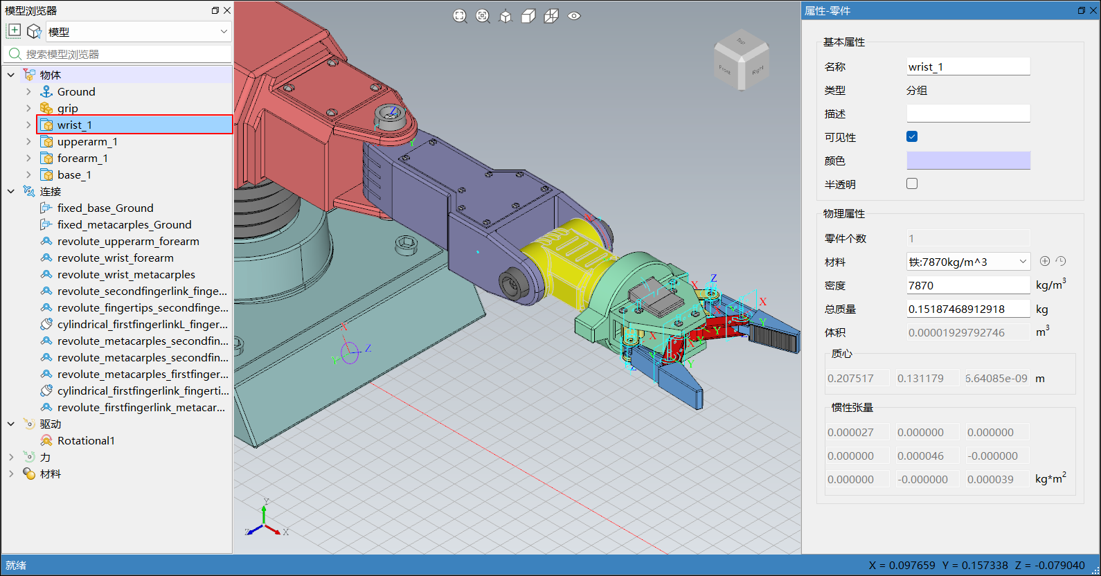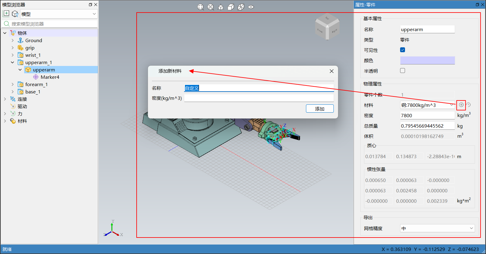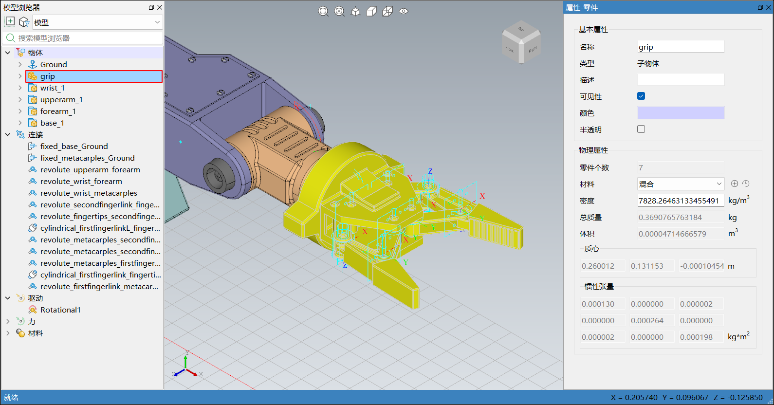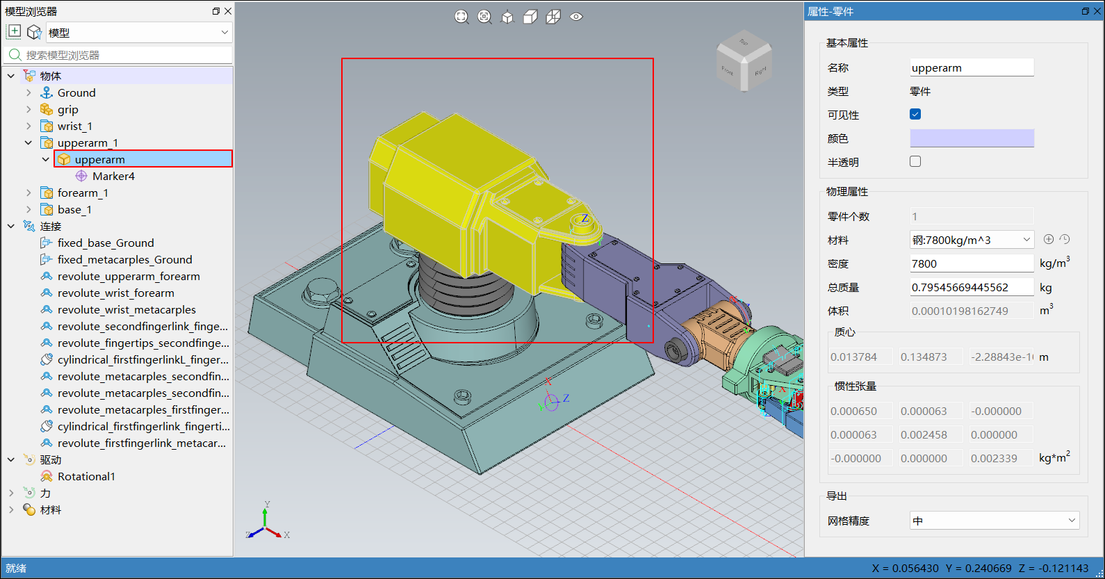 在模型浏览器或三维视图中选中模型后,右侧边栏弹出属性-零件,会显示对应物体的基本属性和物理属性。