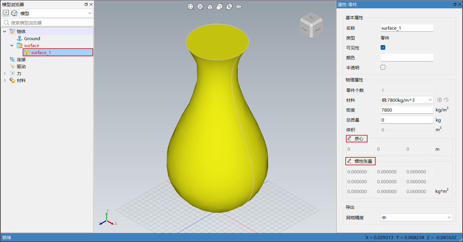| 惯性张量 | 若存在非实体模型,此时惯性张量为 0 | 仅非实体模型可修改 | 否 |
