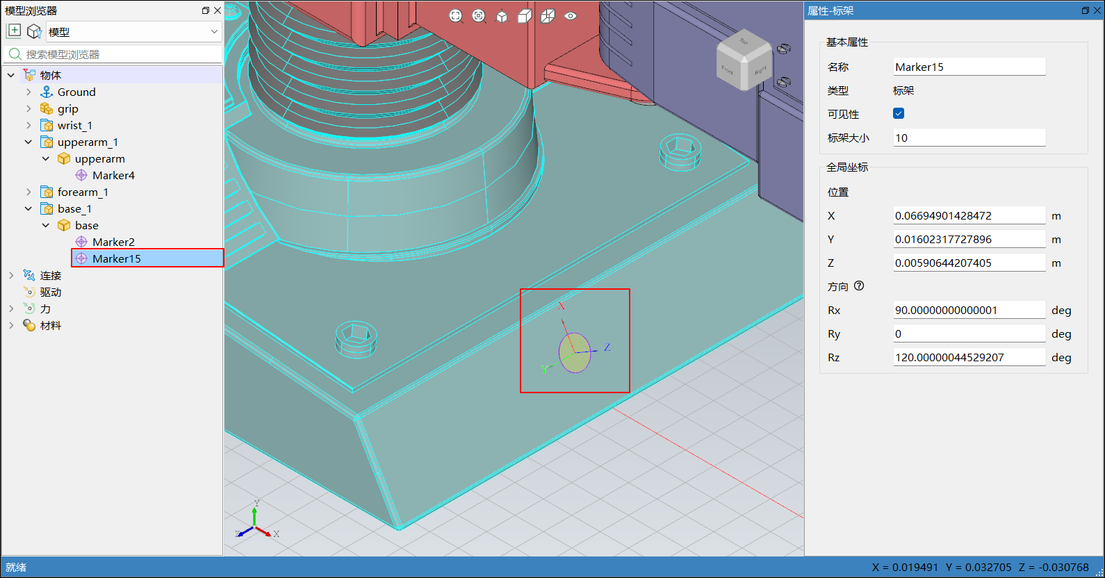 在模型浏览器或三维视图中选中标架或参考标架后,右侧边栏弹出属性-标架,会显示对应标架的属性,包括基本属性和全局坐标,如下图所示:
