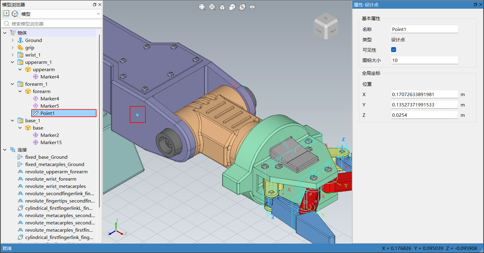 在模型浏览器或三维视图中选中设计点后,右侧边栏弹出属性-设计点,会显示对应设计点的属性,包括基本属性和全局坐标:
