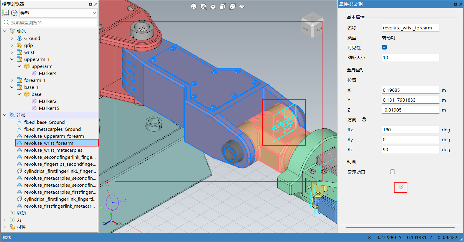 在模型浏览器或三维视图中选中连接后,三维视图中连接所属的两个零件也会高亮显示,右侧边栏弹出属性-连接,会显示对应连接的属性,包括基本属性、全局坐标、动画及参数(默认折叠),下图以转动副为例,单击右下角按钮可展开折叠部分的参数: