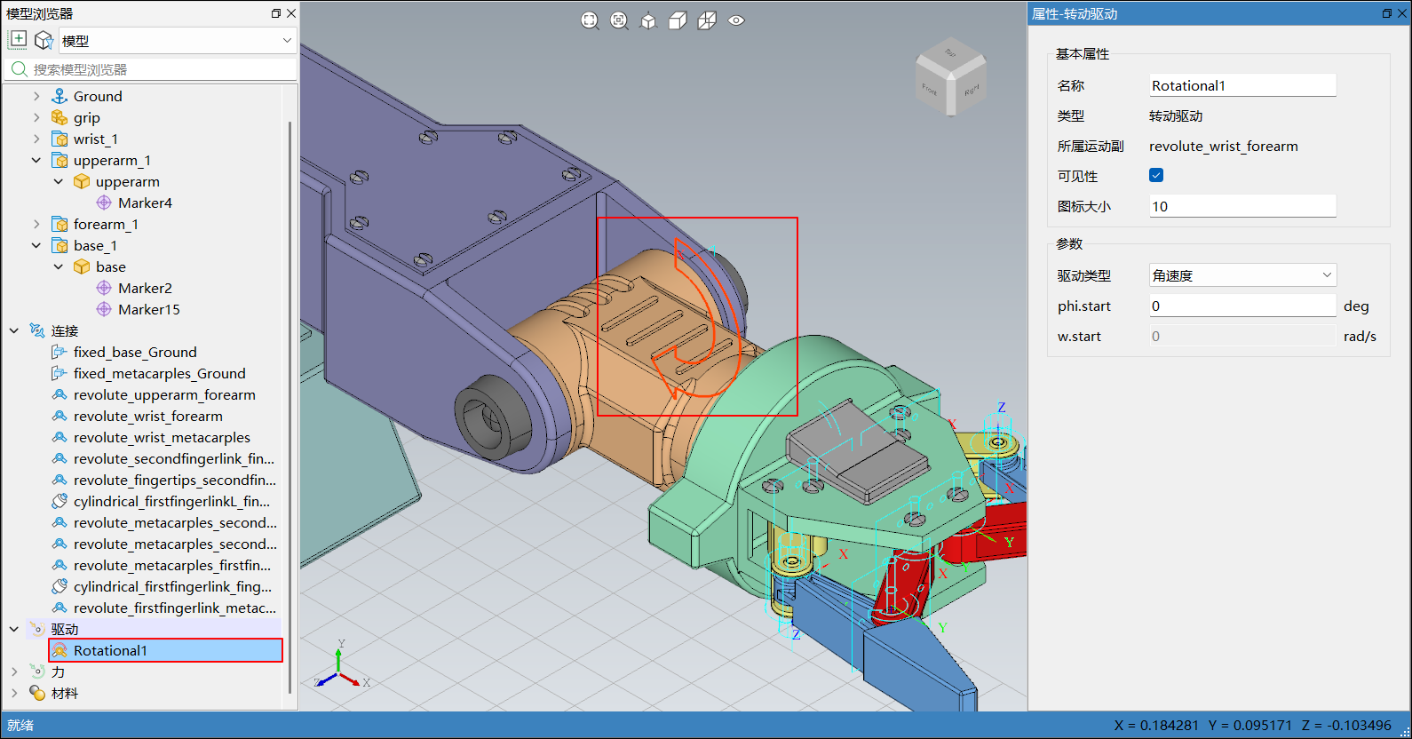在模型浏览器或三维视图中选中驱动后,右侧边栏弹出属性-驱动,会显示对应驱动的属性,包括基本属性和参数,下图以转动驱动为例: