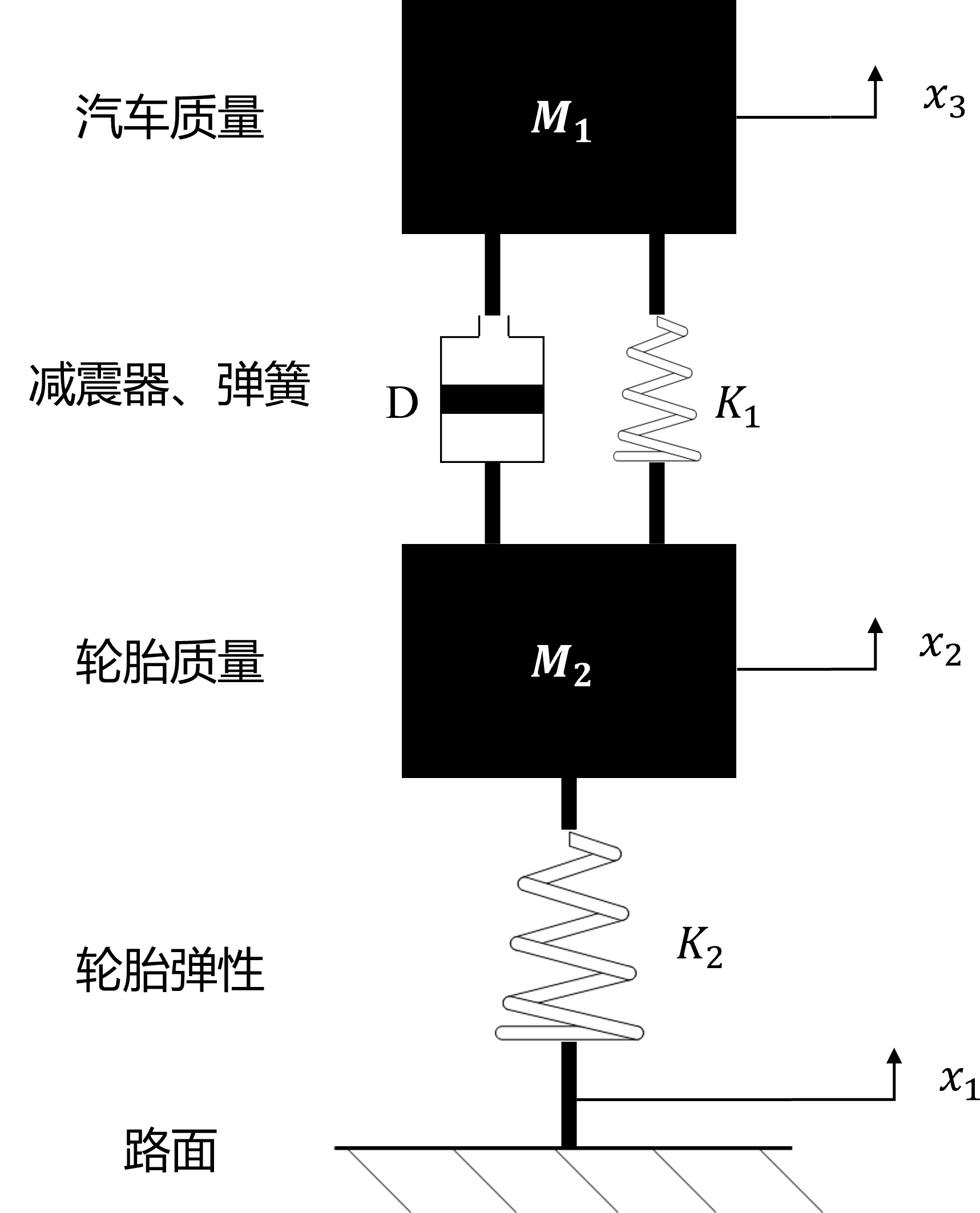 表示车体质量; 表示轮胎质量; 表示减震器阻尼系数; 、 表示弹簧刚度系数; 、 、 分别车体位移、轮毂位移和轮胎的弹性形变。