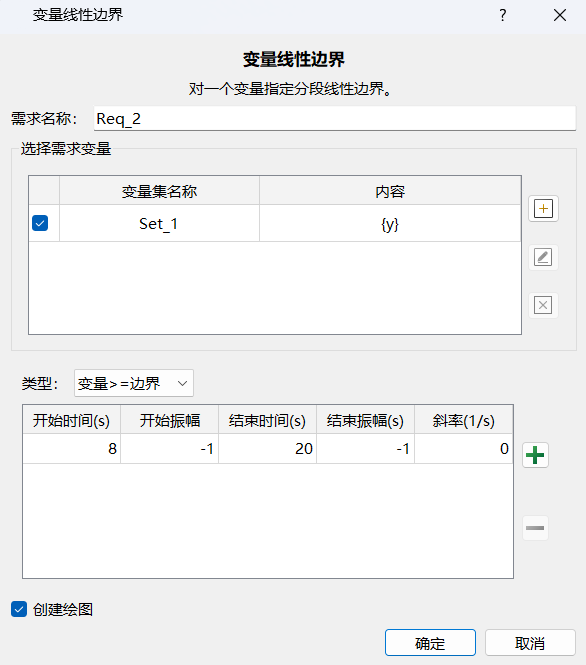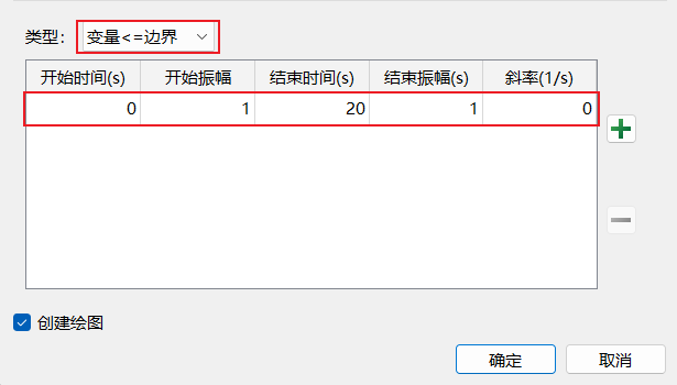 (车体震动幅度)为需求变量,设置类型为变量 <= 边界。设置开始振幅与结束振幅值为“1”,结束时间为“20”秒,开始时间为“0”秒。详细操作如下:
