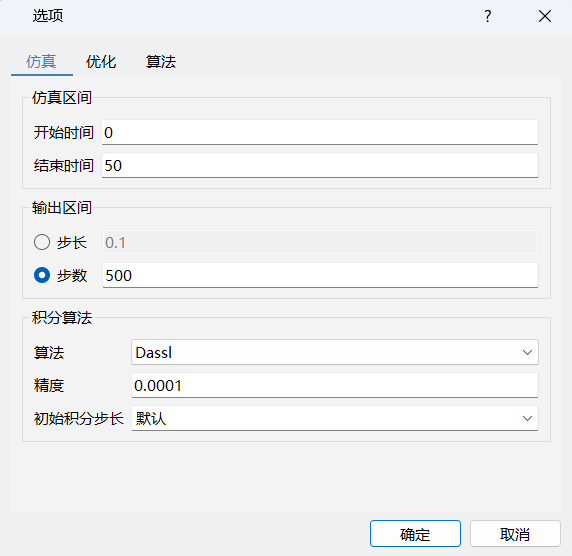 单击选项,设置仿真结束时间为“50”秒,收敛迭代次数为“8”,其他参数默认,具体设置如下图所示: