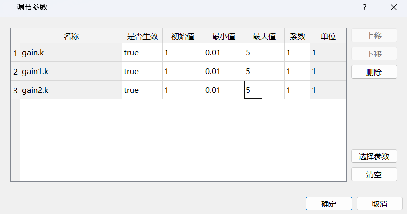 - 最大值和最小值为参数在优化过程中的上下边界,此处设置需要根据实际应用和系统要求,确定每个调节参数的合理范围。