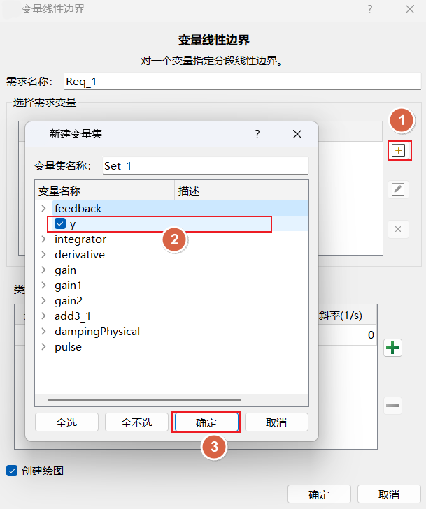 (1) 建立上边界限制。单击新建需求,选择变量线性边界,在弹出的变量线性边界面板中,选择输出变量