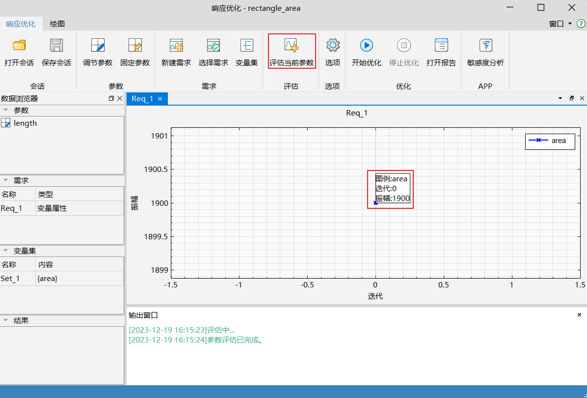 单击评估当前参数,单击绘图上的数据点,可查看在当前参数下,矩形的面积为 1900。