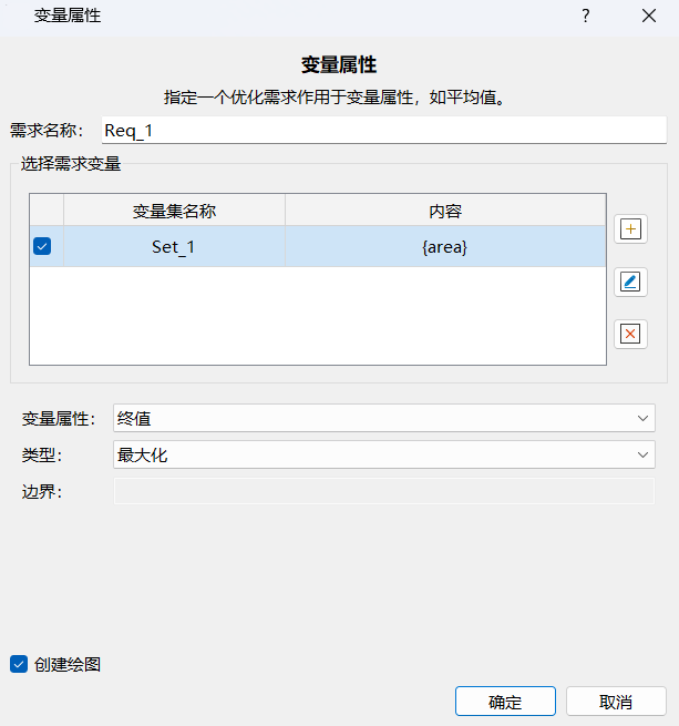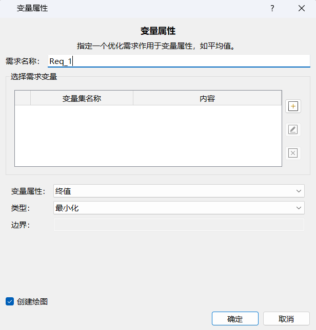 (3) 勾选变量集 Set_1;选择变量属性为终值,类型为最大化,需求名称可自定义。单击确定,完成一个名为 Req_1 的需求创建(此时会默认勾选创建绘图)。