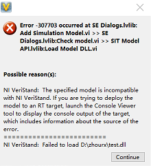 目前遇到的 Veristand 导出问题主要是 MWORKS 中导出的 Veristand 在 NI Veristand 校验工具中校验失败,目前遇到的校验失败原因都是位数不匹配,例如 MWORKS 中导出的 Veristand 是 64 位,安装的 NI Veristand 校验工具是 32 位。位数不匹配时 NI Veristand 校验工具报错如下图: