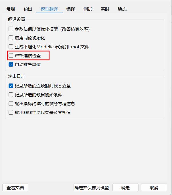 取消勾选仿真设置 > 模型翻译页面中的“严格检查连接”选项,如下图:
