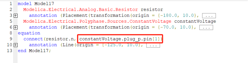 此时连接器constantVoltage.plug_p.pin[1]有 3 级,且第一级 constantVoltage 是 model 类型,不满足当连接中的连接器大于等于 3 级时每一级都为连接器的要求。
