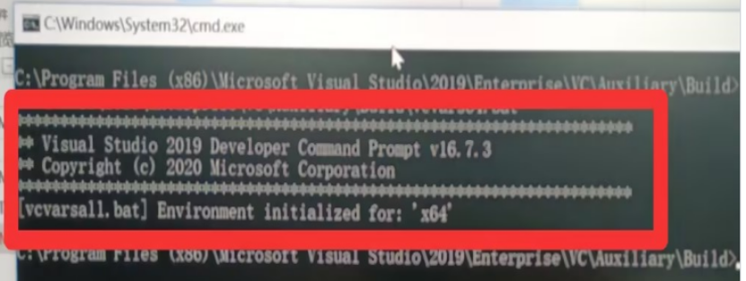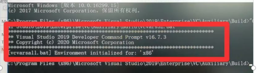 Microsoft Visual Studio/2019/Enterprise/VC/Auxiliary/Build路径下的vcvars32.bat脚本应有上图中的信息输出。