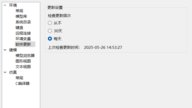 提供软件更新设置选项,用于检查软件版本是否有更新,可以根据需求设置检查更新频次。详细信息,请参见更新 Sysplorer。