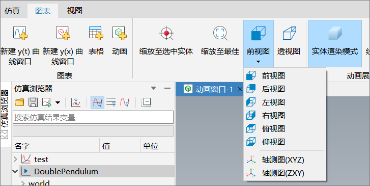 在结果查看器顶部菜单栏,进入图表标签页的功能区,提供新建 3D 动画、动画展示等动画窗口操作选项。当前支持刚体模型和基于场变量的降阶模型的动画展示等操作。