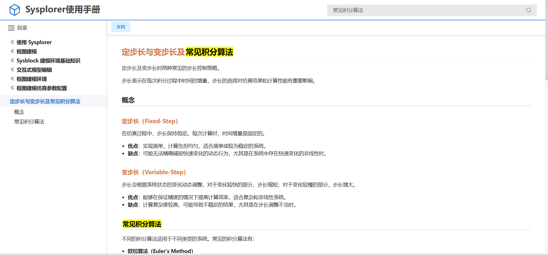 根据系统特点合理选择仿真设置中的积分算法,对于 Sysplorer 中的积分算法可通过 Sysplorer 使用手册查找常见积分算法来选择合适的求解算法。