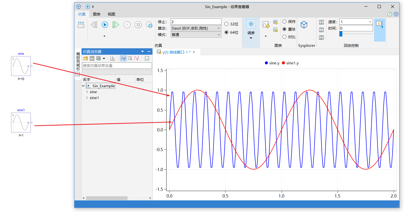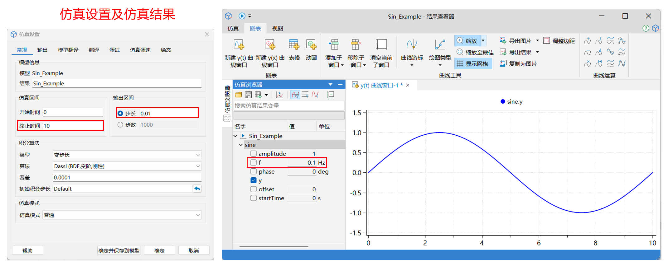 在相同的仿真设置下,正弦输出模块设置不同的频率分别为 10 HZ,1 HZ。