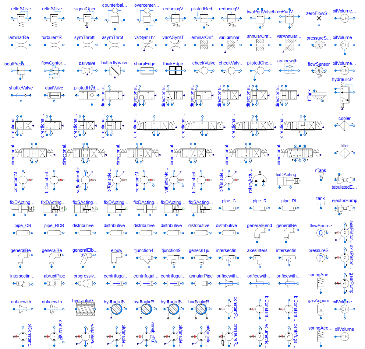 | 流量控制阀库 | 提供多种节流阀、多种缝隙、局部压力补偿器、流量控制阀、球阀和蝶阀等 | ||
