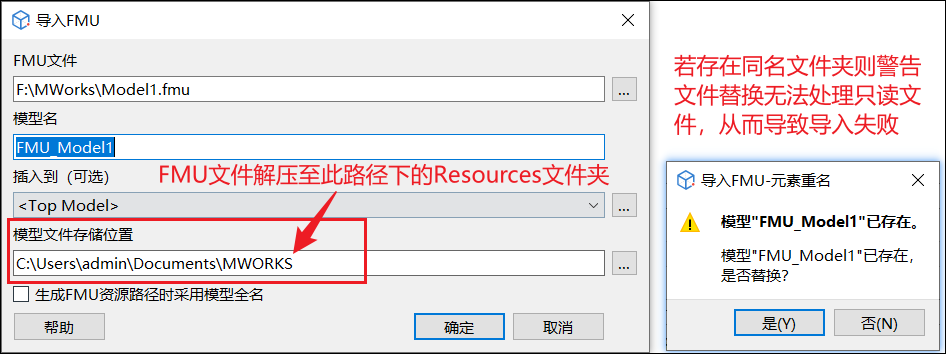 问题分析:类似案例 #1103,若指定的【模型文件存储位置】为只读文件夹,导入程序无法在该路径下生成 FMU 封装模型文件,从而导致导入失败。
