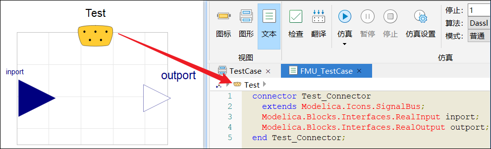 Test.inport,输出变量名为Test.outport。导入 FMU 时,需要根据Modelica规范声明顶层输入输出变量,但上述具有层次结构的变量名不符合Modelica规范。为解决这一限制,Sysplorer 构建了一种 SignalBus 连接器类型(即黄色端口),内部封装了相应的输入与输出变量。SignalBus 连接器可以与其他信号端口连接,连线时界面会弹出内部端口,用户可根据连接关系选择需要连接的信号。
