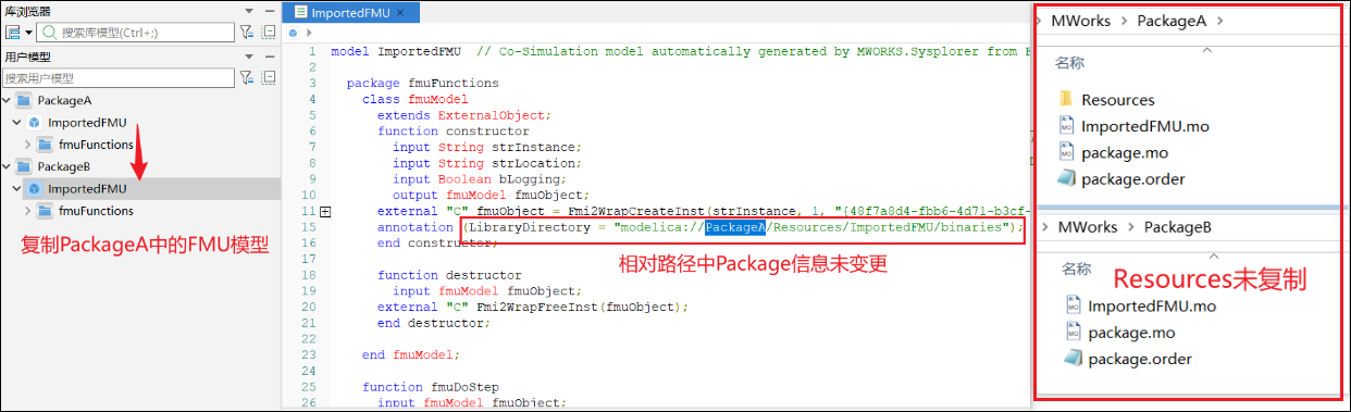 C:\test\TopPackage\SubPackage\BottomPackage\FMU_Model1.mo; - FMU 解压后的资源文件路径为: