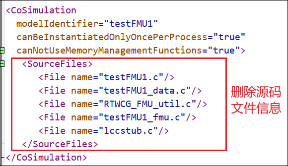 modelDescription.xml存在源码信息时,导入程序默认按源码方式导入。此时可将源码信息删除,如下图红色框部分,使其按动态库方式导入(用户需确保该 FMU 文件包含目标平台环境下的动态库文件):