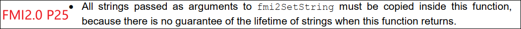 fmiSetString接口函数将外部输入的字符串变量值提供给 FMU。fmiSetString的字符串实参在函数调用结束后会被销毁,因此 FMU 内部需在Set函数执行时拷贝该字符串,而不能仅保存字符串地址。