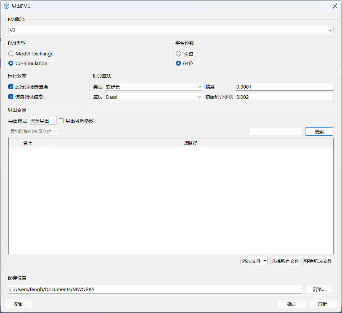 用户可自定义 FMU 文件的保存路径;若目标路径下已存在同名 FMU 文件,将被直接覆盖。